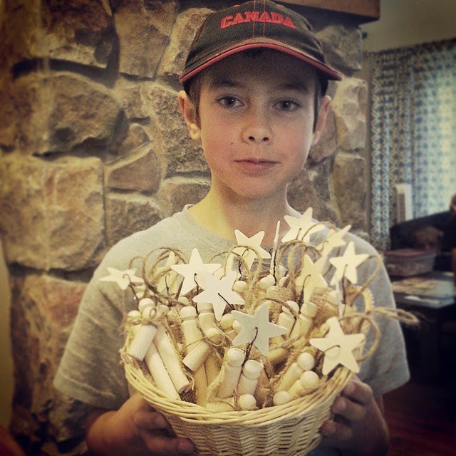 Yeah, he’s pretty cute! He was so proud of himself for using the drill to put holes in all his stars. Justin got in on the action using “wire cutters” to trim our wire to length. Kaleb added the wires to the stars and twisted together. Mom manned the hot glue gun… but then he stuck the pieces together. This basket full of goodies is his end result. He’s planning on coming to my next show with me and selling these ornaments. We’re still working on the whole process of understanding that he has to pay for the supplies out of his sales. Overall though, one proud mama here… love this kid!